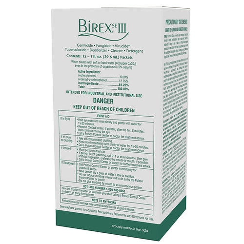 Birex SE III Surface Disinfectant Concentrate Operatory Pack - 12 x 1 fl oz Packet. Each packet makes 1 gallon of solution. EPA-approved, one-step cleaner and disinfectant effective against a broad-spectrum of pathogens including the highly resistant mycobacterium tuberculosis (TB). List N approved for effective use against COVID-19 and SARS-CoV2 (Delta variant). Complies with OSHA’s Blood Borne Pathogens Standard and CDC guidelines for dental cleaning and disinfection.