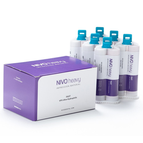 Introducing the NIVO Heavy Body VPS Impression Material, designed for dental professionals demanding high precision and reliability. This fast-setting, heavy body vinyl polysiloxane (VPS) impression material is available in 50ml cartridges, packaged in a bulk box of 50 for your clinic's convenience. Engineered to provide exceptional dimensional stability and resistance to deformation, this product captures detailed and precise impressions, essential for accurate dental work. The no-tips format allows you to use your preferred dispensing method, offering flexibility and ease of use.